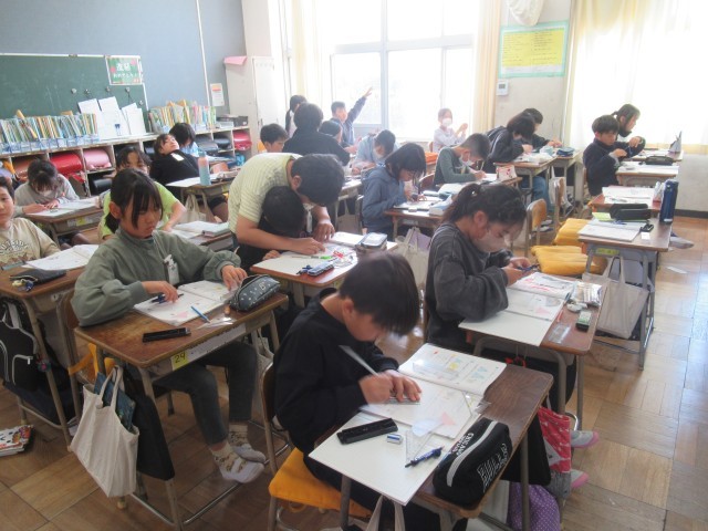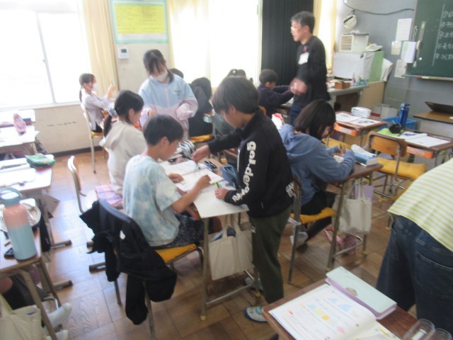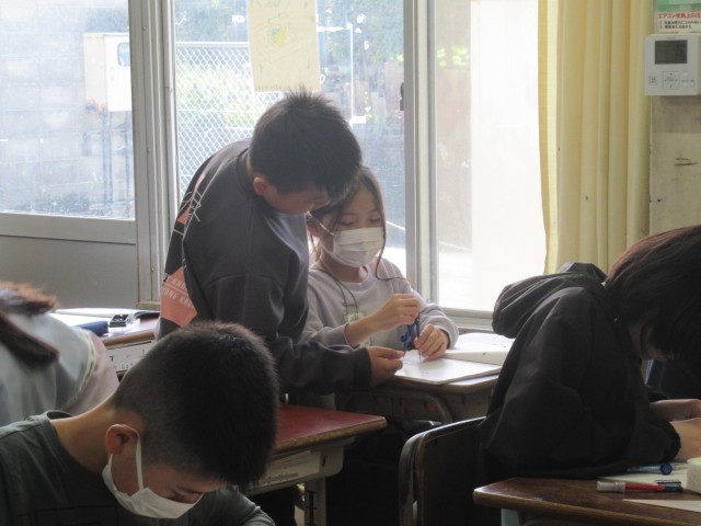 四角形を対角線で分けたら、必ず合同な三角形になるのかどうか調べていました。友達と教え合う場面が見られました。「みんなで伸びる」姿です。