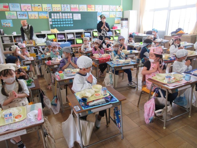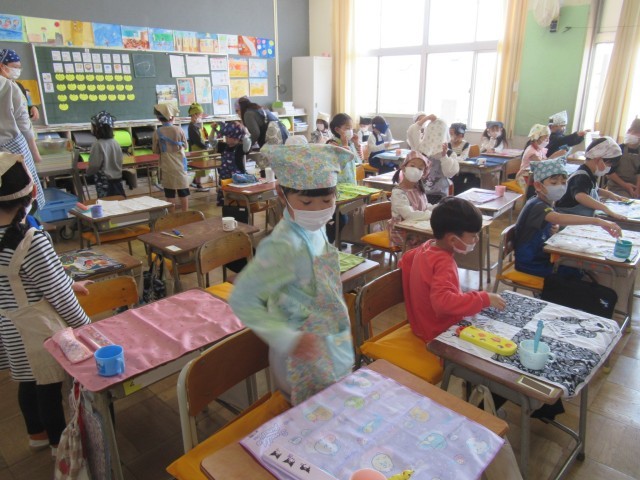 配膳も上手に出来ました。待っている姿勢もとてもよかったです。牛乳の開け方を先生から教わった後、待ちに待った「いただきます!」