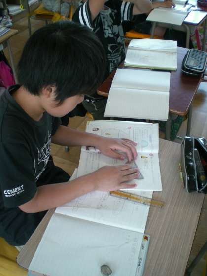 分度器の使い方を覚えた4年生の子どもたち。180度よりも大きな角度はどうやって測ったらよいのかをみんなで考えました。