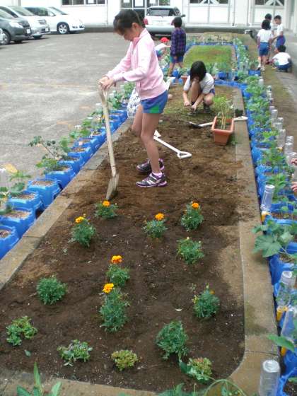 校舎東側の花壇では、5年生が雑草を抜いたり、花の苗の世話をしたりしていました。