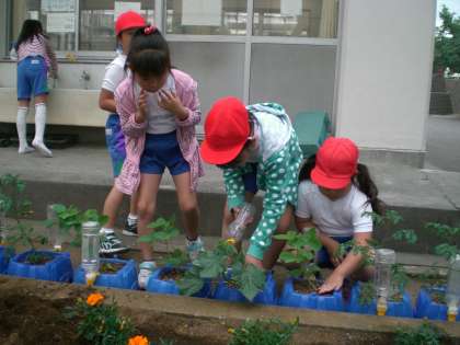 花壇の周りでは、2年生が野菜の苗に水を与えていました。