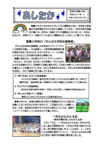 学校だより「あしたか3号」(表面)です。詳しくは、配布文書をご覧ください。