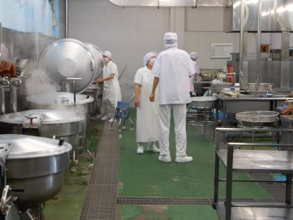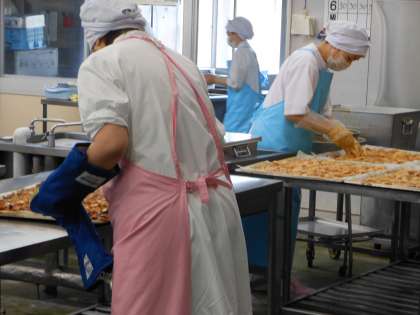 愛鷹小の給食室では、愛鷹小・浮島小・浮島中の子どもたちにおいしい給食を食べてもらおうと、今日も調理師さんたちががんばって作っていました。残さず食べてくれることを願って一所懸命に作っていました。