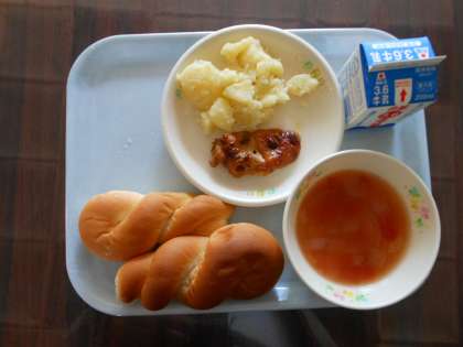 今日のメニューは、タンドリーチキン、こふきいも、ミネストローネスープ、ねじりパンと牛乳です。