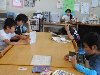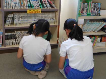 運動会が明後日に近づいてきました。運動場で練習をするクラスがあったり、準備に取り組んでいる係もいますが、熱心な読書家たちは、図書委員の児童や図書ボランティアの方の協力を得て、今日も昼休みの図書室で読書三昧です。