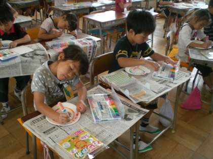 紙皿にカラーペン、クーピー、クレヨンを使って、模様を描きました。