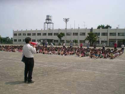 1つ目は、教室から運動場までの避難経路を覚え、『(お)さない』『(は)しらない』『(し)ゃべらない』『(も)どらない』の約束を守って、避難する訓練です。約束を意識して行動し、避難開始の放送から7分間で全員の無事を確認できました。