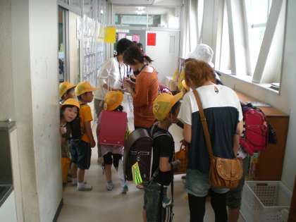 2つ目は、引き渡し訓練です。メール配信をうけて迎えに来ていただいた保護者の方に、子どもの引き渡しを行いました。