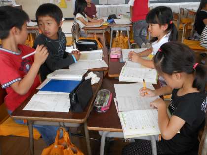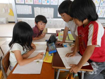 時間と時こくのまとめの問題をグループで協力し合って解きました。分からないところを教え合っています。