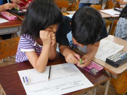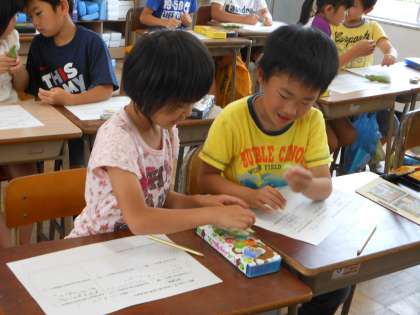 そら豆を見たり、さわったり、においをかいだりして、感じたことを伝え合いました。