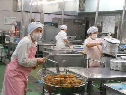 給食室では、今日(6月19日)も子どもたちの笑顔を期待して、調理師さんたちが一所懸命に調理をしていました。