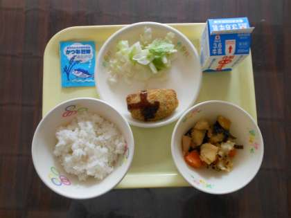 今日のメニューには、野菜の旨煮やボイルドキャベツと共に静岡県らしい『黒はんぺんチーズフライ』が……。