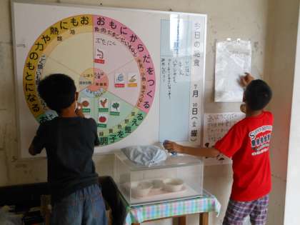中央廊下では、給食委員の児童が栄養区分表を作成していました。