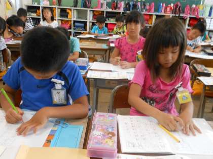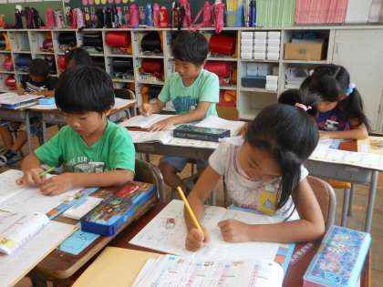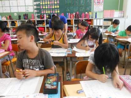 今日の漢字練習は「学」です。画数が多くなり、字のバランスをとるのが難しくなってきました。