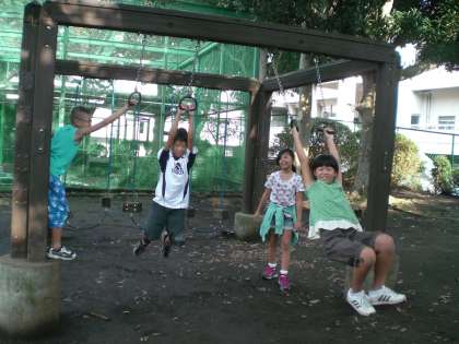 鷹の子森では、アスレチックの吊り輪で子どもたちが遊んでいました。
