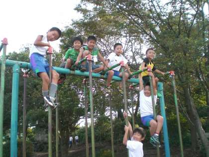 運動場東側の遊具では、登り棒の上まで上がって得意気な子どもたちの姿がありました。