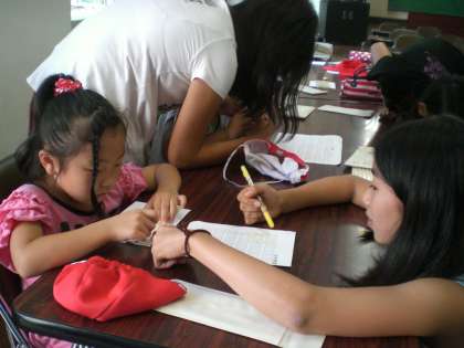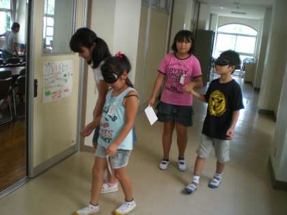 福祉委員会の5,6年生の子どもたちが、アイマスク体験の誘導をしたり、点字の打ち方を教えたりしていました。