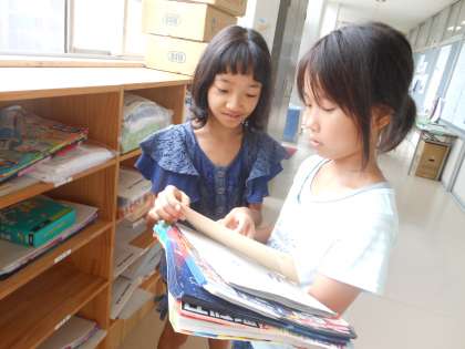係の子どもたちが配付物の確認をして教室に運んでいきました。