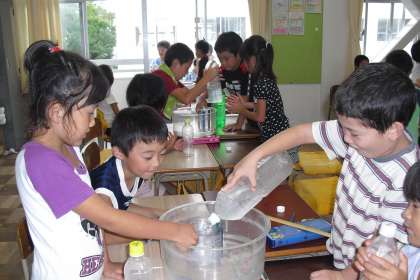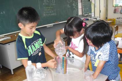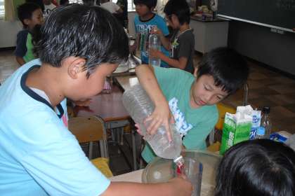 ペットボトルに入っている水の量をリットルますを使って調べました。班ごとに協力しながら調べることができました。