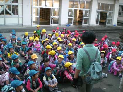 1年生は、校区にある『ニューウェルサンピア』に歩いて行きます。出発まで時間があるので、教室で朝の会などをやった後、児童玄関前に集合して先生の話を聞きました。