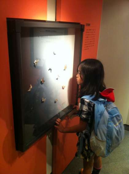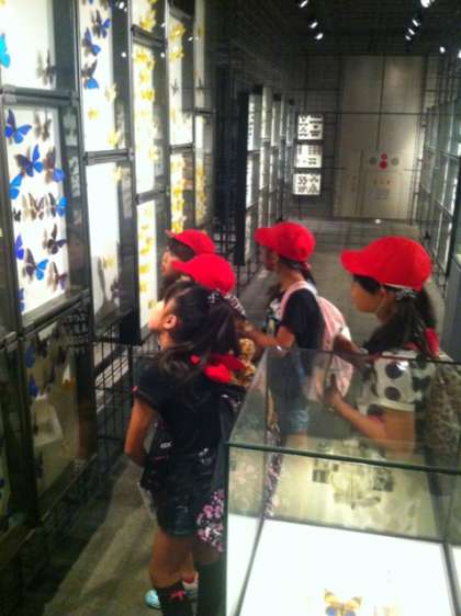 綺麗なちょうちょやサイズの小さなちょうちょまで、たくさん展示されていて、みんな、じっくり観察中です。