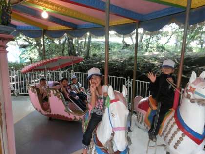 今回の探検中に乗り物タイムを設けて、豆汽車かメリーゴーランドのどちらかに班で乗りました。