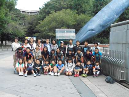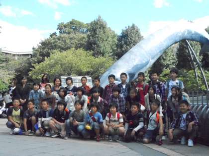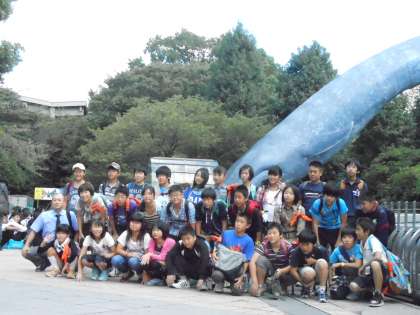 クジラの像の前でクラスごとに記念撮影をしてから、先ず国立科学博物館に入って、班別研修が始まりました。