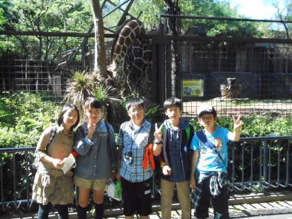 キリンの前で記念写真をパチリ!