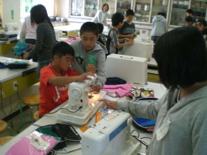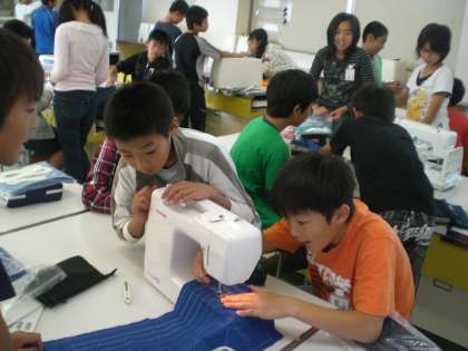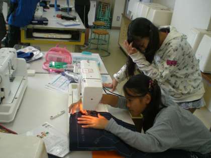 一年ぶりのミシンの扱いにとまどう子どもたち。