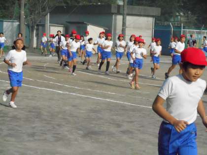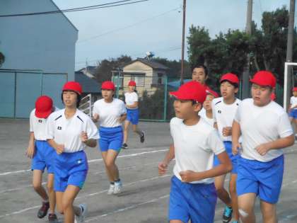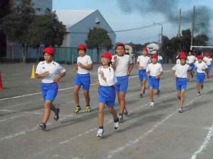 子どもたちに混じって、先生方も一緒に走って体力作りです。