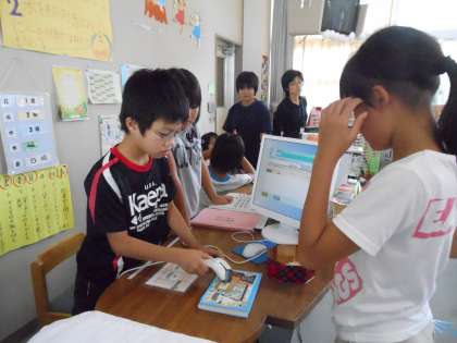 図書室では、図書委員会の子どもたちが図書ボランティアの方の見守る中で図書の返却・貸し出しの仕事を行っていした。