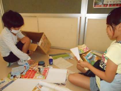2階の廊下では、広報委員会の子どもたちが掲示物の仕分けをしていました。