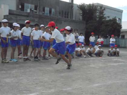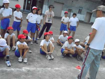 スピードが落ちないバトンパスについて、みんなで考えながらやってみました。