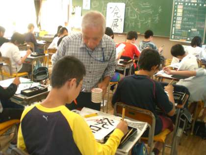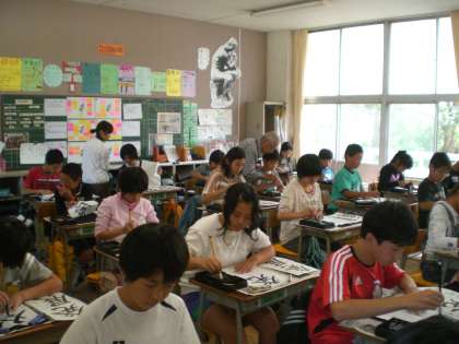 お手本を見ながらバランスよく書こうと、集中して書いています。
