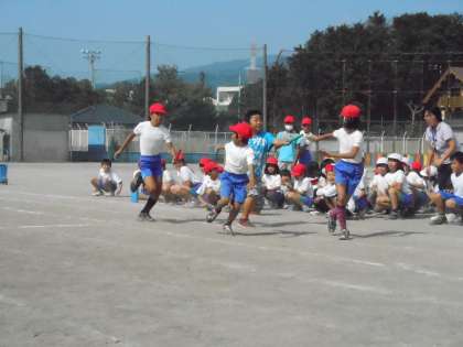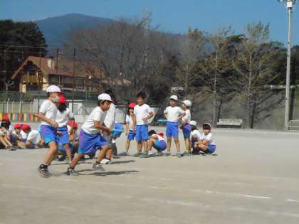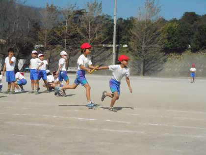 今日は2年生と4年生の体育の時間が一緒だったので、お互いにリレーを見合いました。バトンパスの方法などたくさん学べました。