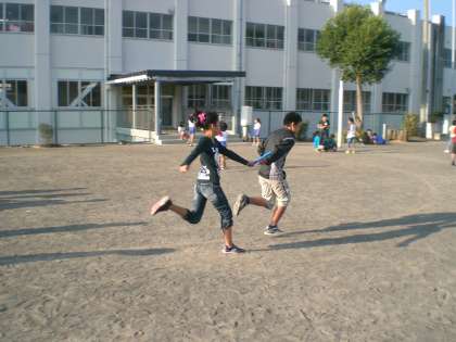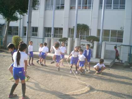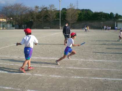 長縄跳びなどで遊ぶ子どももいましたが、リレー大会が近いので、バトンパスの練習をするクラスが目立ちました。