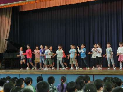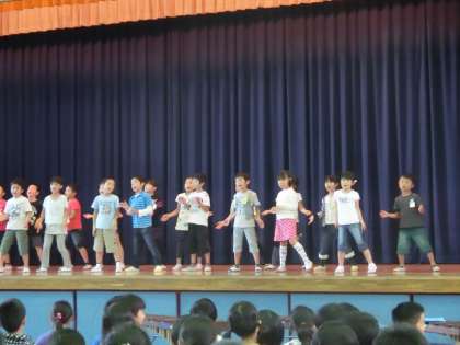 今月の歌「YUME日和」の振り付けを集会のステージで披露しました。