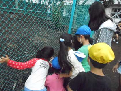 2時間目が終わった後の20分休みには低中学年の子どもたちが中心になって鷹ノ子森のウサギの広場にウサギを見にきます。