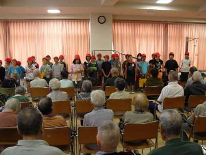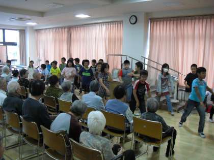福祉体験で、おじいちゃんおばあちゃんと一緒にあやとりをしたり、マジックを披露したりしました。また、「上を向いて歩こう」や「もみじ」をうたったり、ソーラン節を踊ったりしました。