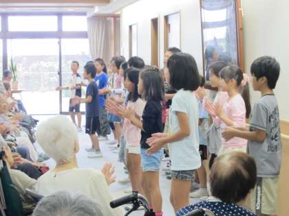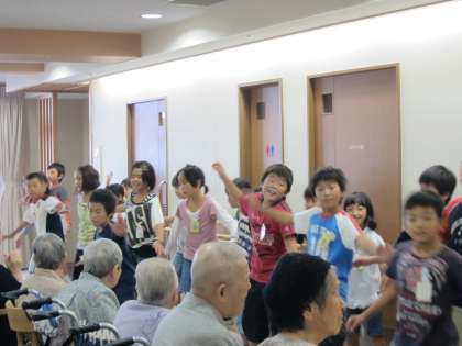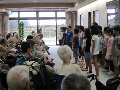 ホールで入所の方が集まってくださる中、ちょっぴり照れながらも『もみじ』『上を向いて歩こう』『ソーラン節』を見ていただきました。