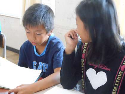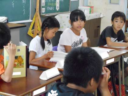 国語の学習で話し合い活動を行っています。ごみを減らすためのアイデアを考えて、友だちに意見を伝えています。