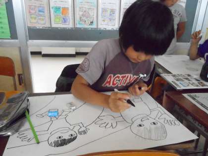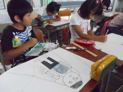 学校生活の中で、一番心に残っている場面を切り取って絵にしています。体の動きや、顔の表情にも気をつけて、描きました。