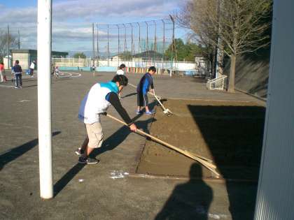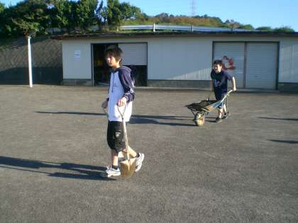 体育委員会の子どもたちも、雨でできた溝を修復したり、砂場の砂をならしたり、朝運動の準備をしたりしていました。
