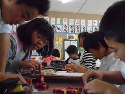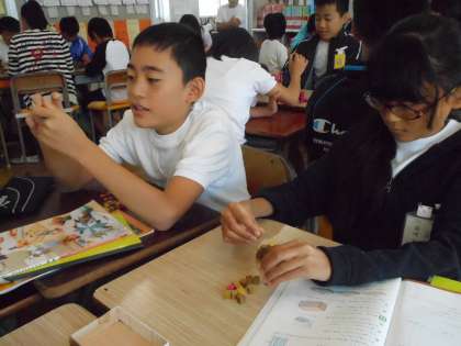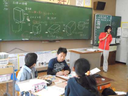 体積の求め方の復習をしました。1立方cmのブロックを並べて確認しました。子どもたちは楽しそうに活動していました。