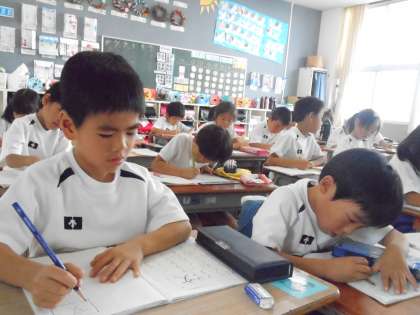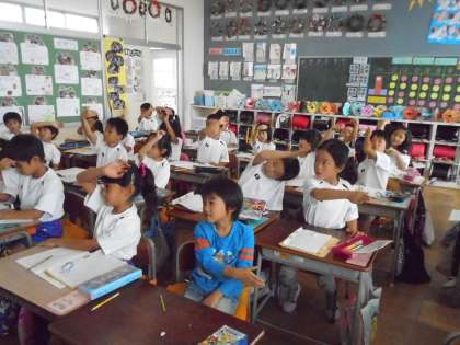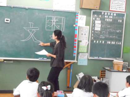 『文』という字の左はらいと右はらいをしっかり意識できるよう、腕を毛筆の筆に見立てて大きく空中に字を書きました。