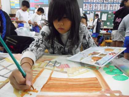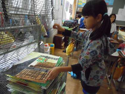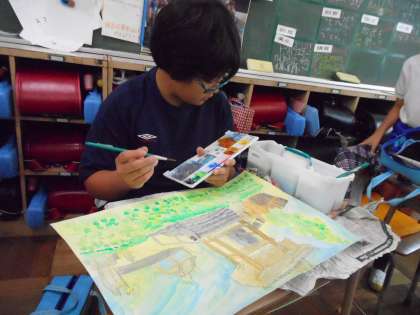 屋根の瓦や石垣の石を、一つ一つていねいにぬっています。