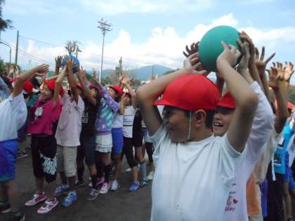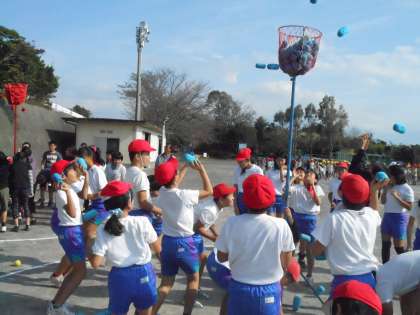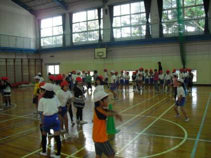 4年生は体育館で行いました。今月の歌を振り付けをして歌った後、レクリェーションをしました。