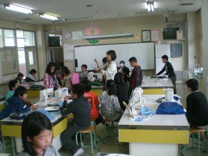 エプロンも完成に近づいています。イニシャルのぬいとりに入っている子もいます。がんばって作ろうね。