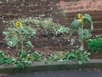 正門南側の畑には、11月にもかかわらずヒマワリの花が咲いていました。