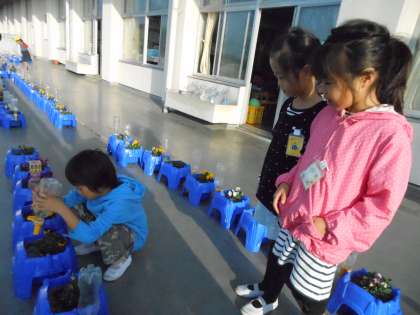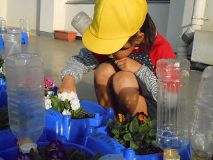 花に水やりをする1年生、担任と一緒に笑顔で教室に向かう1年生。いよいよ今日の学校生活がスタートです。